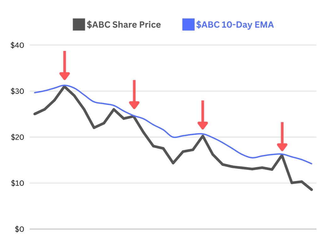 Let’s look at an example. Below is a hypothetical graph of ABC Corp’s stock (ticker $ABC). The grey line represents their share price, while the blue line represents the 10-day EMA. As you can see, shares of ABC Corp trended down during this period, and when looking to rally back, it was rejected at its 10-day EMA on four separate occasions!